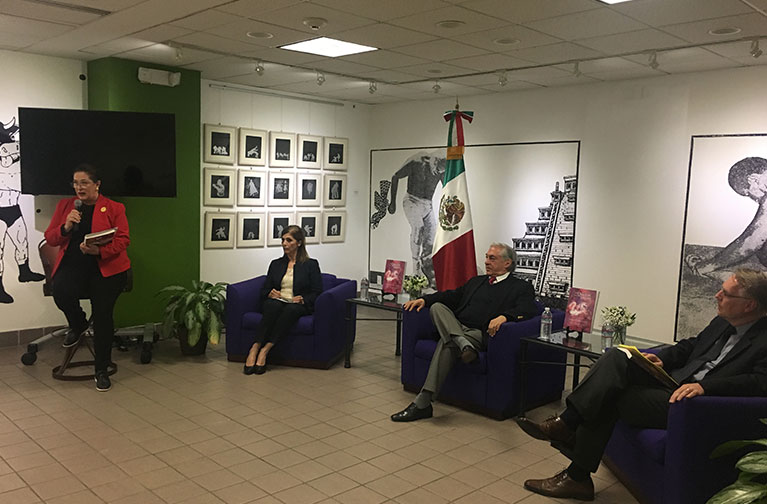 Lic. Rosa María Batel, Coordinadora del Archivo Histórico de PEMEX; Alejandro Carrillo Castro y Maarten Van Delden, académico de la Universidad del Sur de California.